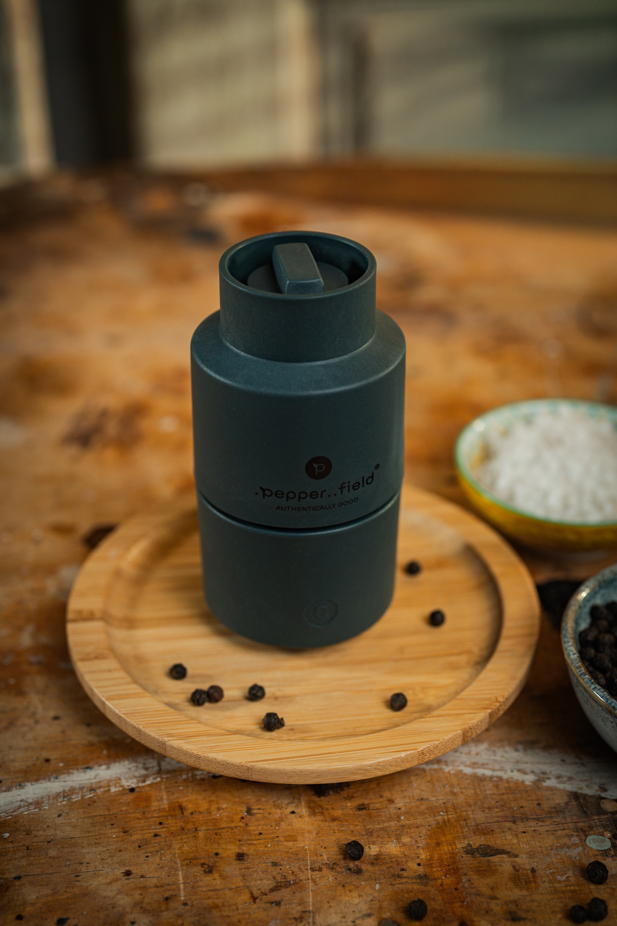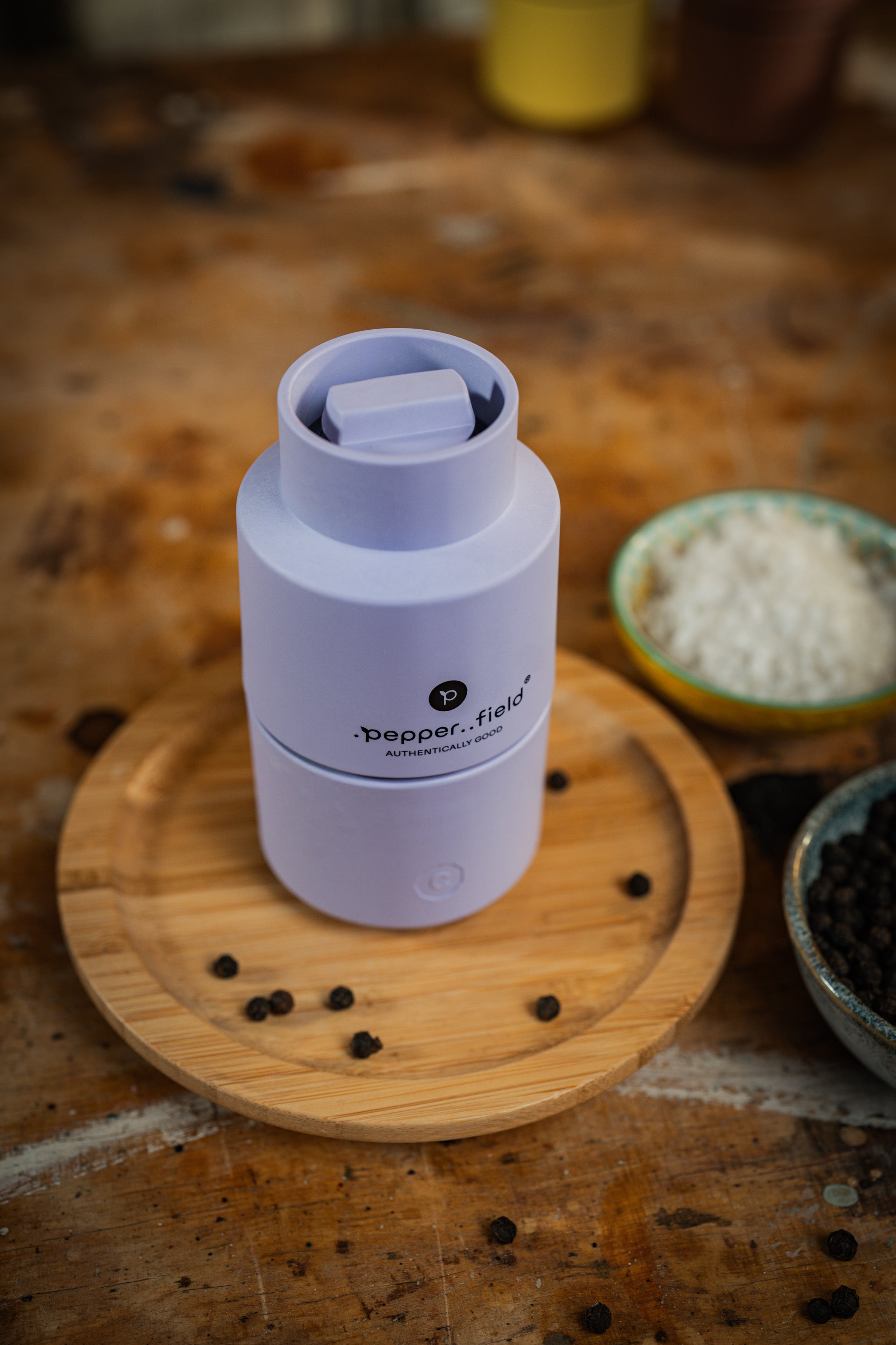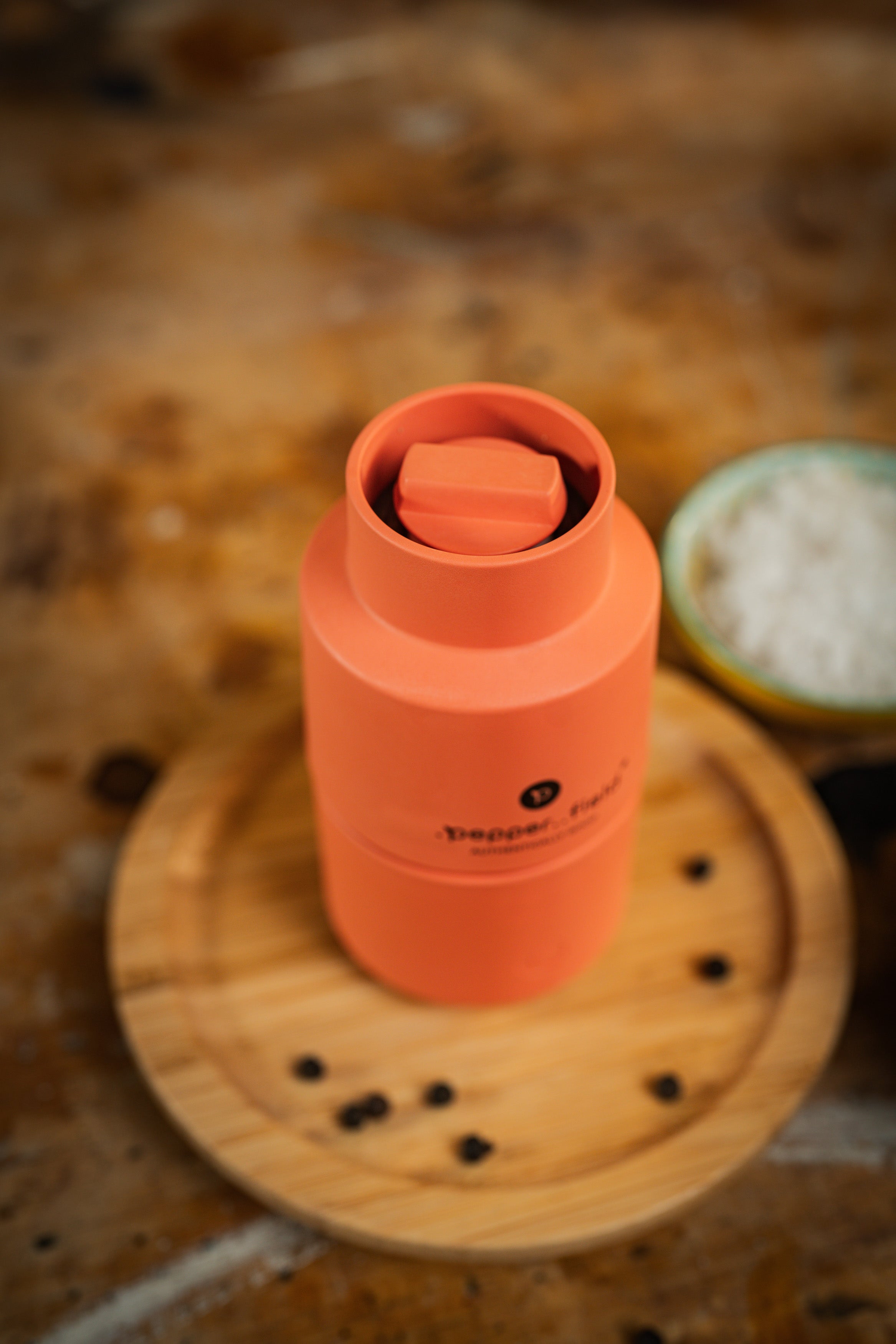 The grinding mechanism of the colorful grinders is at the top, as is the coarseness adjustment. The flip-top lid for filling Kampot m pepper or Kampot salt can be found at the bottom of the grinder.