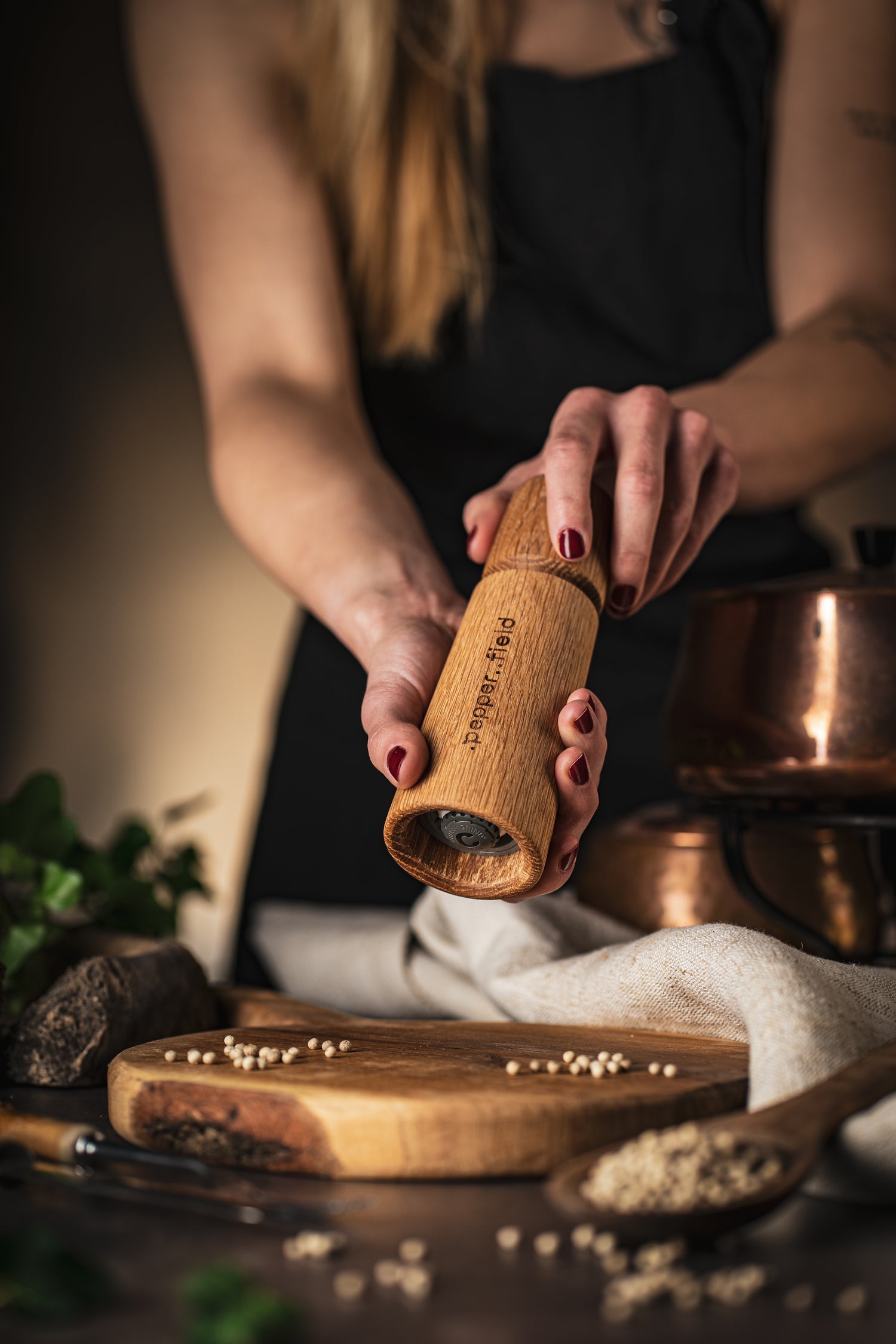 We stored the grinders together with the pepper in a special cardboard box made from recycled materials. The lid of the box can be engraved, thereby imparting a completely unique style to the set. The choice of material is not accidental. Not only does it look great, but the box can also be easily recycled or upcycled.