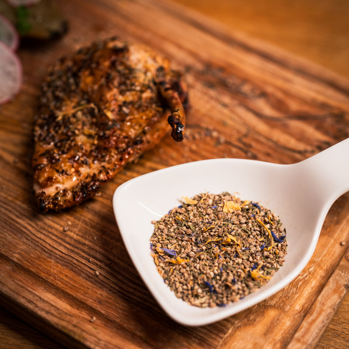 Composition: White Kampot pepper 75%, dried thyme 8%, salt 7.5%, lemon peel 7.5%, dried yarrow 0.6%, dried cornflower 0.6%, dried sunflower 0.3%.