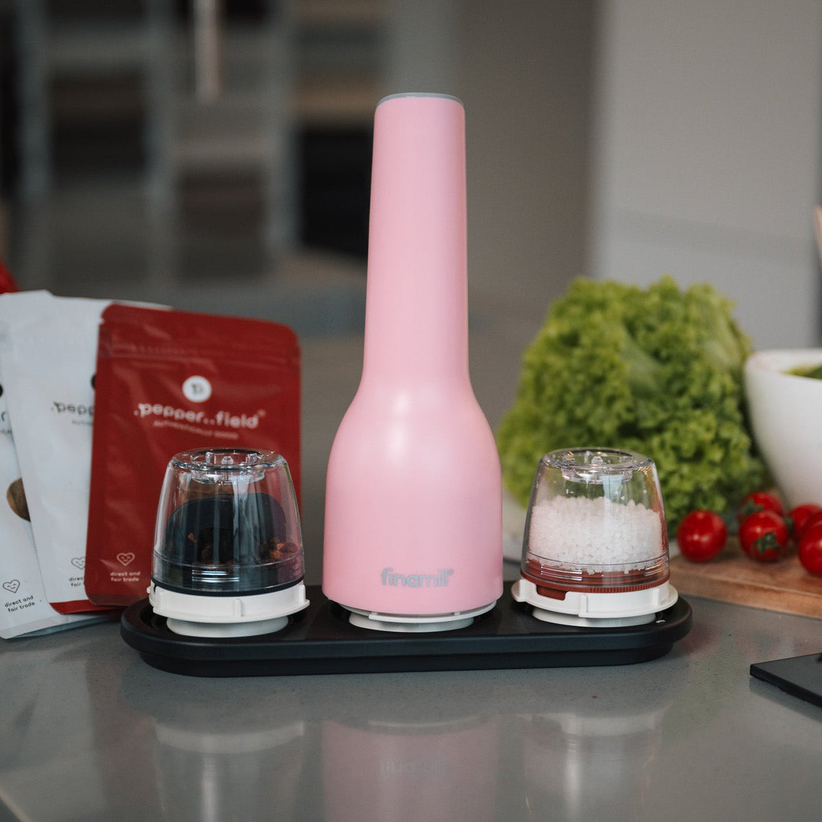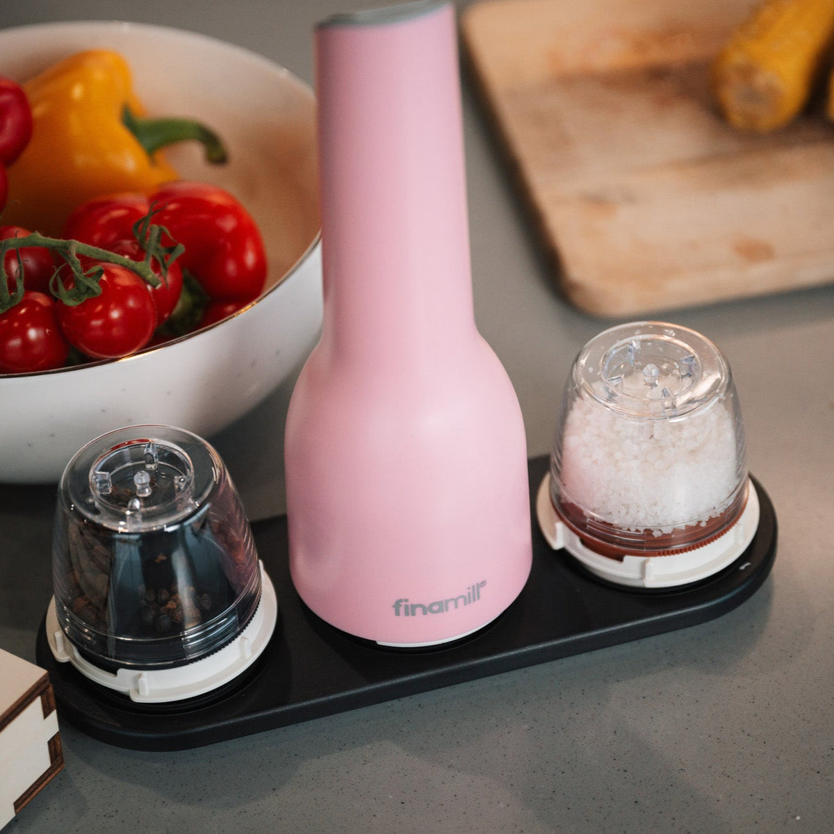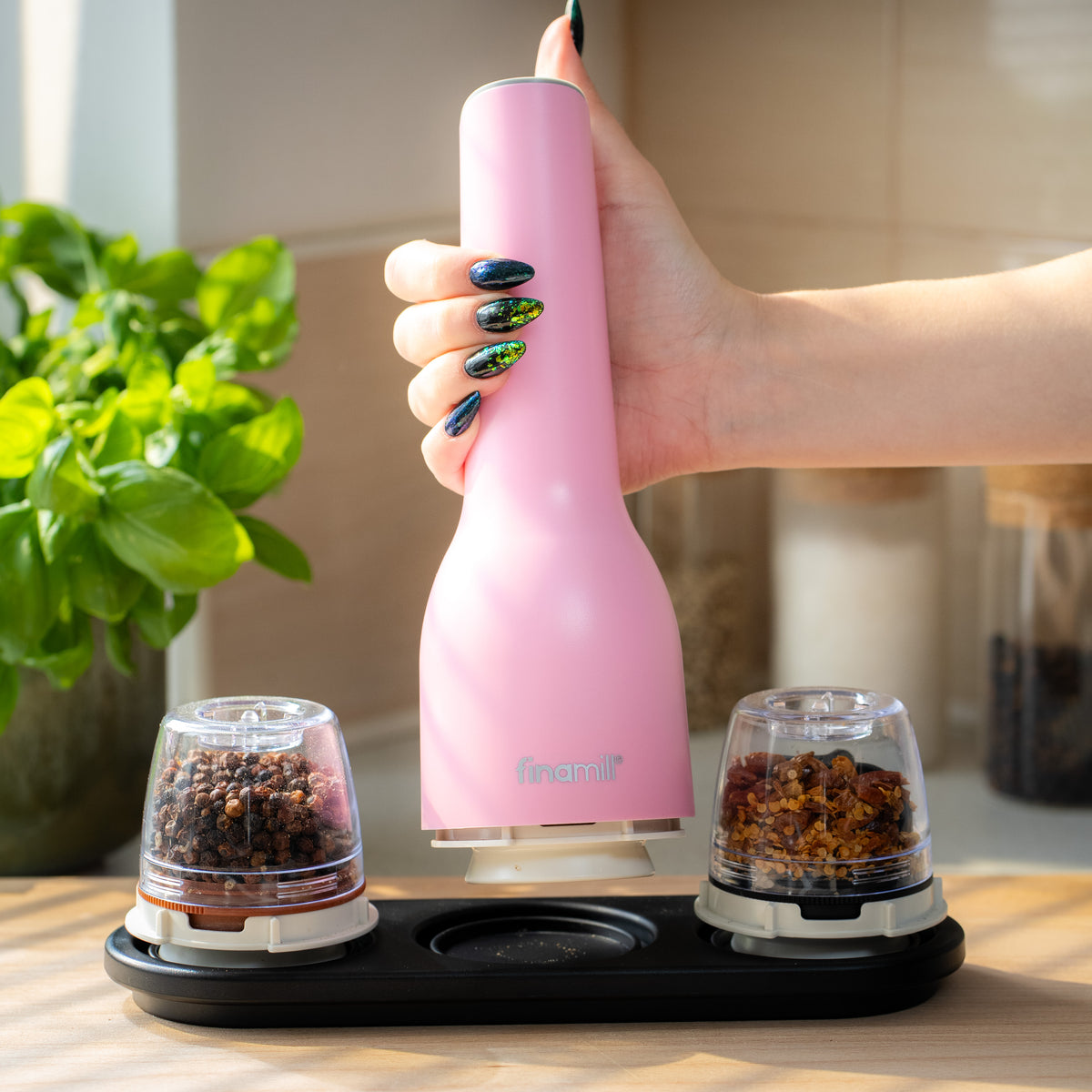 With a single press of the button, both pepper and spices are ground directly over the food, while you cook with the other hand.