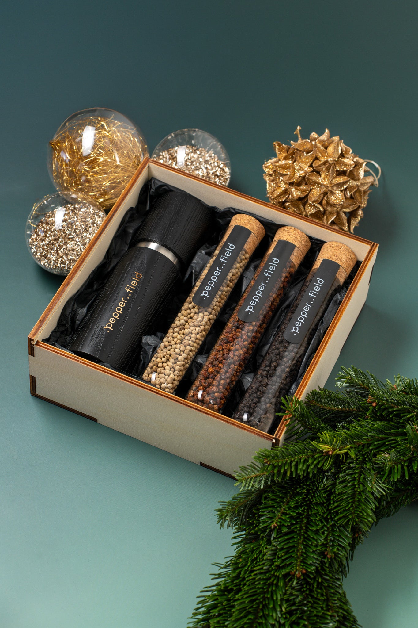 We fill glass tubes by hand with selected grains of Kampot pepper and complement them with Czech mills, wooden boxes, and personal messages.